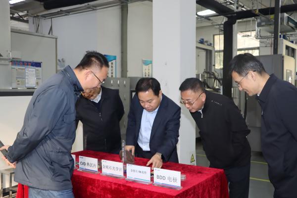 洪蛟一行参观三磨所展厅、高性能工具全国重点实验室,详细了解企业发展历程和科技创新情况,深入功能金刚石实验车间,调研企业生产经营情况。